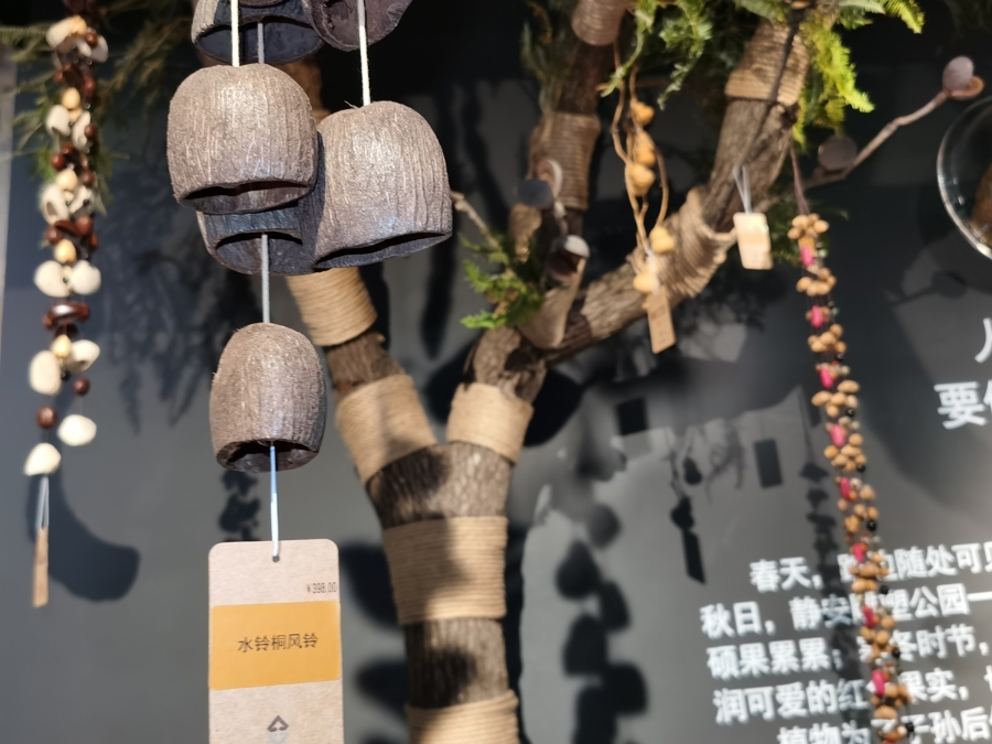 静安雕琢公园艺术中心B2层的“种子+潮玩+文创”区域内,静安园林公司副司理王蔚倾销起了职工“手搓”的榼藤娃娃、种子心愿瓶和果壳风铃。