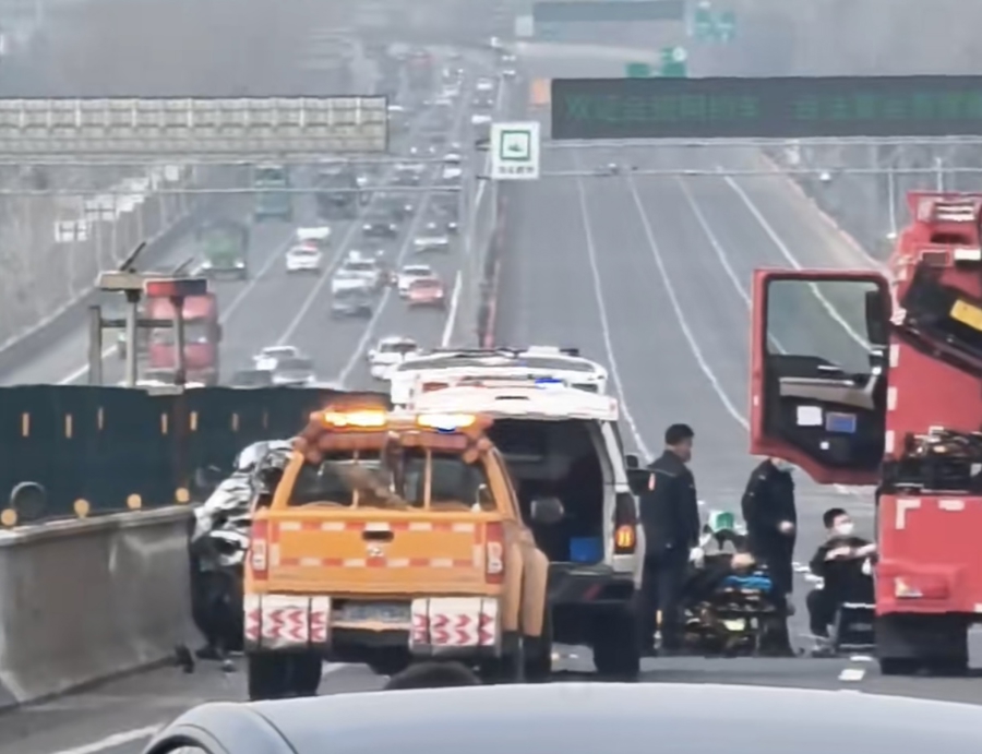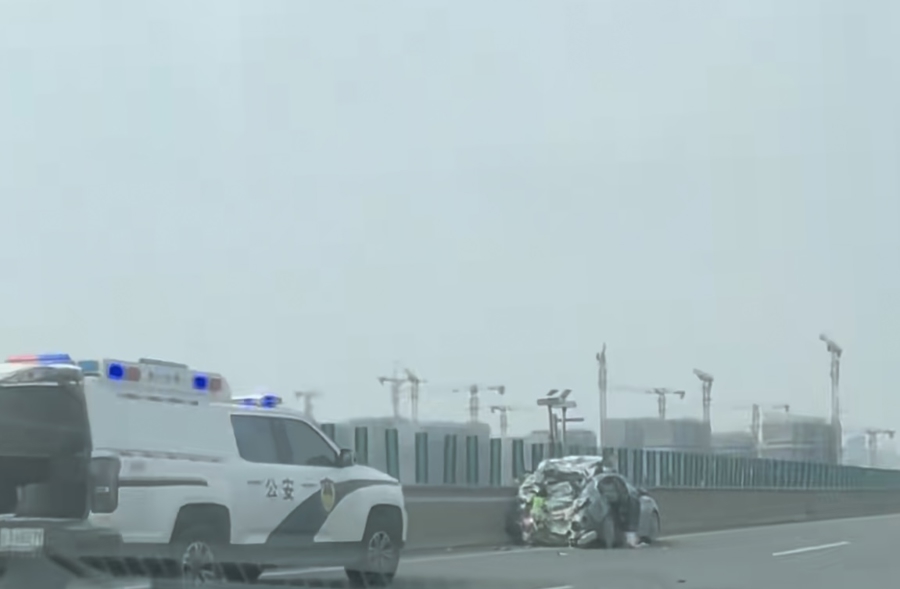 眼见者形容,最终轿车停在一号车谈上,集卡则停在济急车谈上;碎屑洒落在路面上。