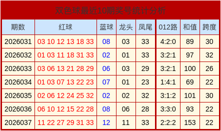上期双色球的开奖号码中,和值为153,跨度为22,012路比为2:2:2。