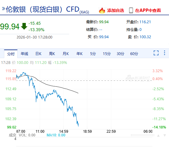 北京时间1月30日下午,现货白银跌破100美元/盎司,日内跌超13%。