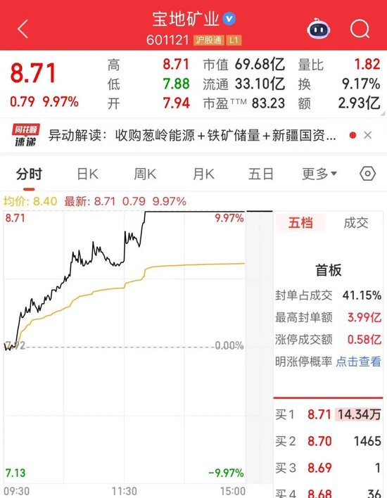 本日,宝地矿业股价陆续拉升,午后涨停。步骤收盘,该股报8.71元/股,涨停板上有超14万手封单。