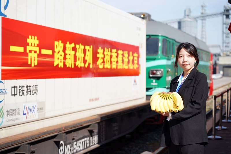 2024年10月20日,首趟中老铁路(万象—昆明—北京·平谷)国际冷链专列暨“京滇·澜湄线”运送着产自老挝的390吨优质香蕉,由磨憨港口入境,通过全程冷链运送抵达北京。新华社 发